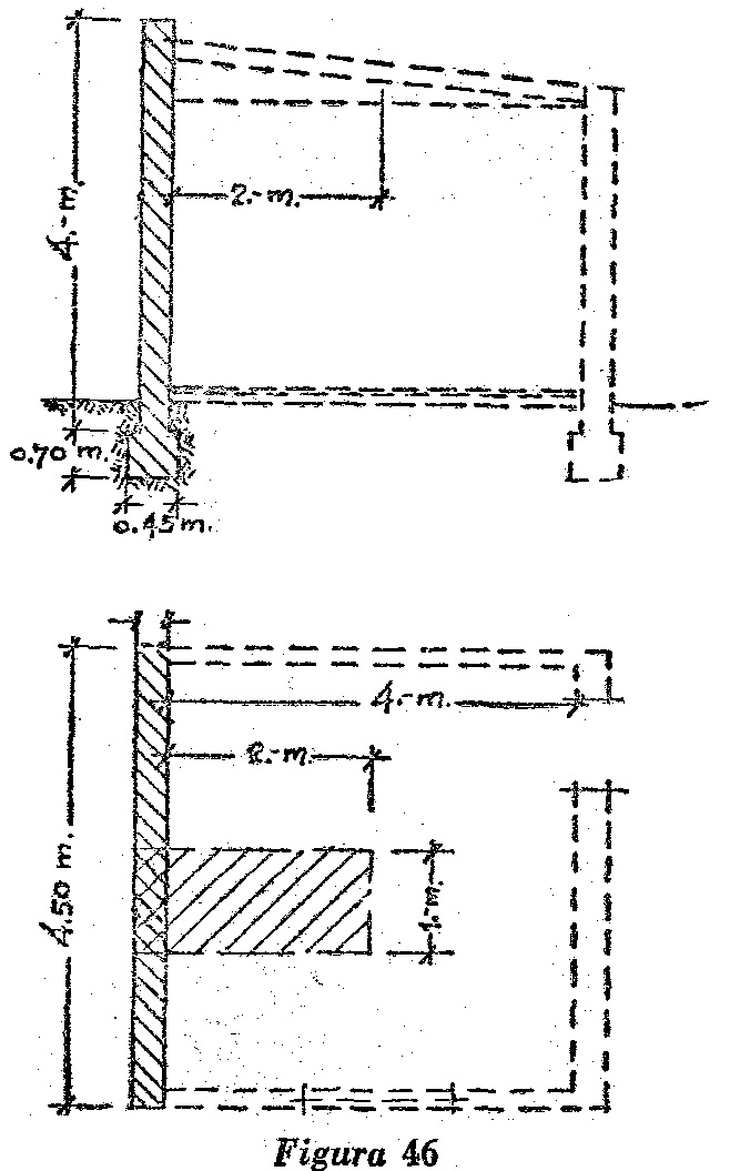 Además, siendo que el muro a analizar mide 4,50 m. de longitud, para el estudio a realizar no se necesita considerar la longitud total, sino que el resultarlo puede obtenerse con mayor facilidad refiriéndolo a un metro de longitud. En consecuencia, para establecer la carga que trasmitirá al terreno, determinaremos el peso de un metro de ancho de cubierta y un metro de longitud del muro y del cimiento respectivo, figura 46.