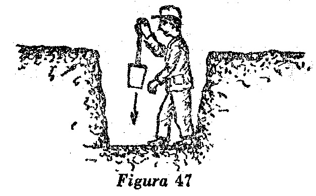 Procedimiento de la pala: hecha la excavación y habiendo alcanzado ya la profundidad en que se pretenda fundar la obra, se toma la pala de punta y levantándola d« manera que la empuñadura quede a la altura de la cabeza del que opera, se la impulsa violentamente hacia abajo teniéndola siempre tomada de la empuñadura; la pala se clavará en el suelo y si su penetración no es mayor de 2 a 3 cm., puede admitirse que el suelo es bastante resistente para resistir el peso de obras como las mencionadas en el párrafo anterior. Figura 47.