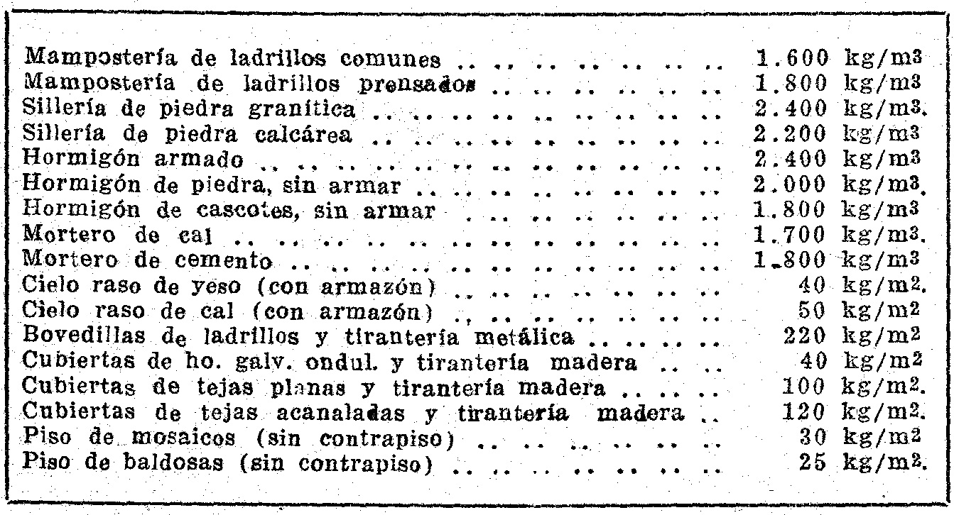 Mampostería de ladrillos comunes 1.600 kg/m3 Mampostería de ladrillos prensados 1.800 kg/m3 Sillería de piedra granítica 2.400 kg/m3. Sillería de piedra calcárea 2.200 kg/m3 Hormigón armado 2.400 kg/m3 Hormigón de piedra, sin armar 2.000 kg/m3. Hormigón de cascotes, sin armar 1.800 kg/m3 Mortero de cal 1.700 kg/m3. Mortero de cemento 1.800 kg/m3 Cielo raso de yeso (con armazón) 40 kg/m2. Cielo raso de cal (con armazón) 50 kg/m2 Bovedillas de ladrillos y tirantería metálica 220 kg/m2 Cubiertas de ho. galv. ondul. y tirantería madera 40 kg/m2 Cubiertas de tejas planas y tirantería madera 100 kg/m2. Cubiertas de tejas acanaladas y tirantería madera 120 kg/m2. Piso de mosaicos (sin contrapiso) 30 kg/m2 Piso de baldosas (sin contrapiso) 25 kg/m2. |