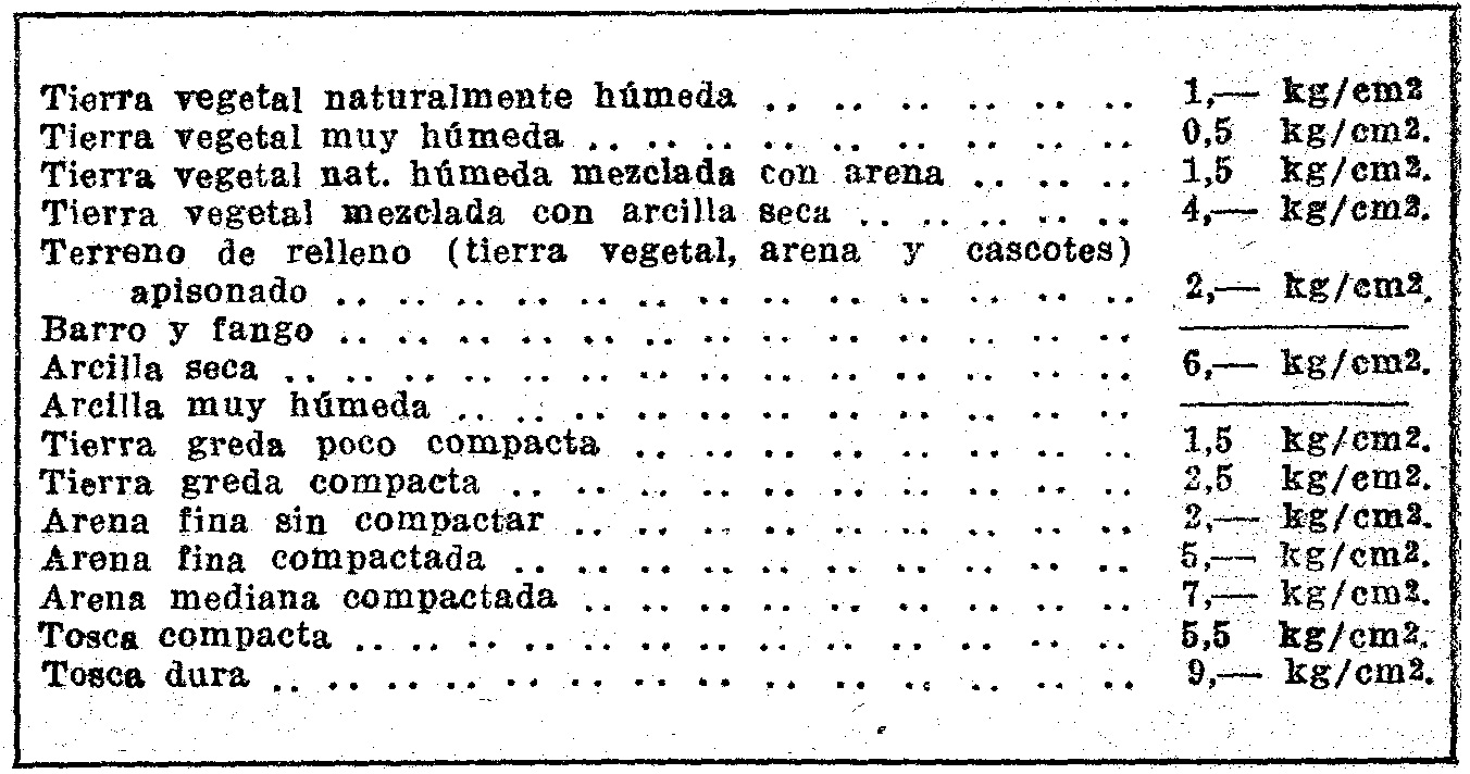 Tierra vegetal naturalmente húmeda 1,— kg/em2 Tierra vegetal muy húmeda 0,5 kg/cm2. Tierra vegetal nat. húmeda mezclada con arena 1,5 kg/cm2 Tierra vegetal mezclada con arcilla seca 4,— kg/cm2. Terreno de relleno (tierra vegetal, arena y cascotes) apisonado 2,— kg/em2. Barro y fango —————— Arcilla seca 6,— kg/cm2. Arcilla muy húmeda ——————- Tierra greda poco compacta 1,5 kg/cm2. Tierra greda compacta 2,5 kg/cm2. Arena fina sin compactar 2,— kg/cm2. Arena fina compactada 5,— Kg/cm2. Arena mediana compactada 7,— kg/cm2. Tosca compacta 5,5 kg/cm2. Tosca dura 9,— kg/cm2. |