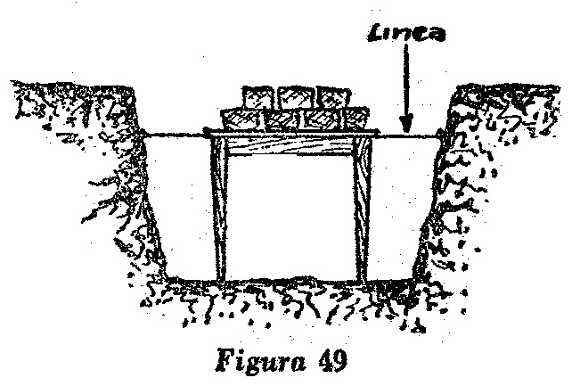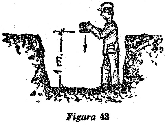 Procedimiento de la posa: en las mismas condiciones riel caso anterior, se toma un adoquín de formas más o menos regulares y se lo deja caer desde una altura de 1 m. arriba del suelo a ensayar. Si el suelo es suficientemente resistente, el adoquín rebotará dejando una huella de penetración no mayor de 0,5 cm.; si el terreno presentara un hundimiento mayor debe creerse que el suelo no permite más que obras pequeñas como tapiales, tabiques, etc., pero no muros de carga o de espesores de 30 cm., o más; si el adoquín no rebota y queda incrustado aunque !a penetración no fuera más que de 2 a 3 cms., demostraría que el suelo es demasiado compresible y no admitirá sino cargas muy reducidas. Figura 48.