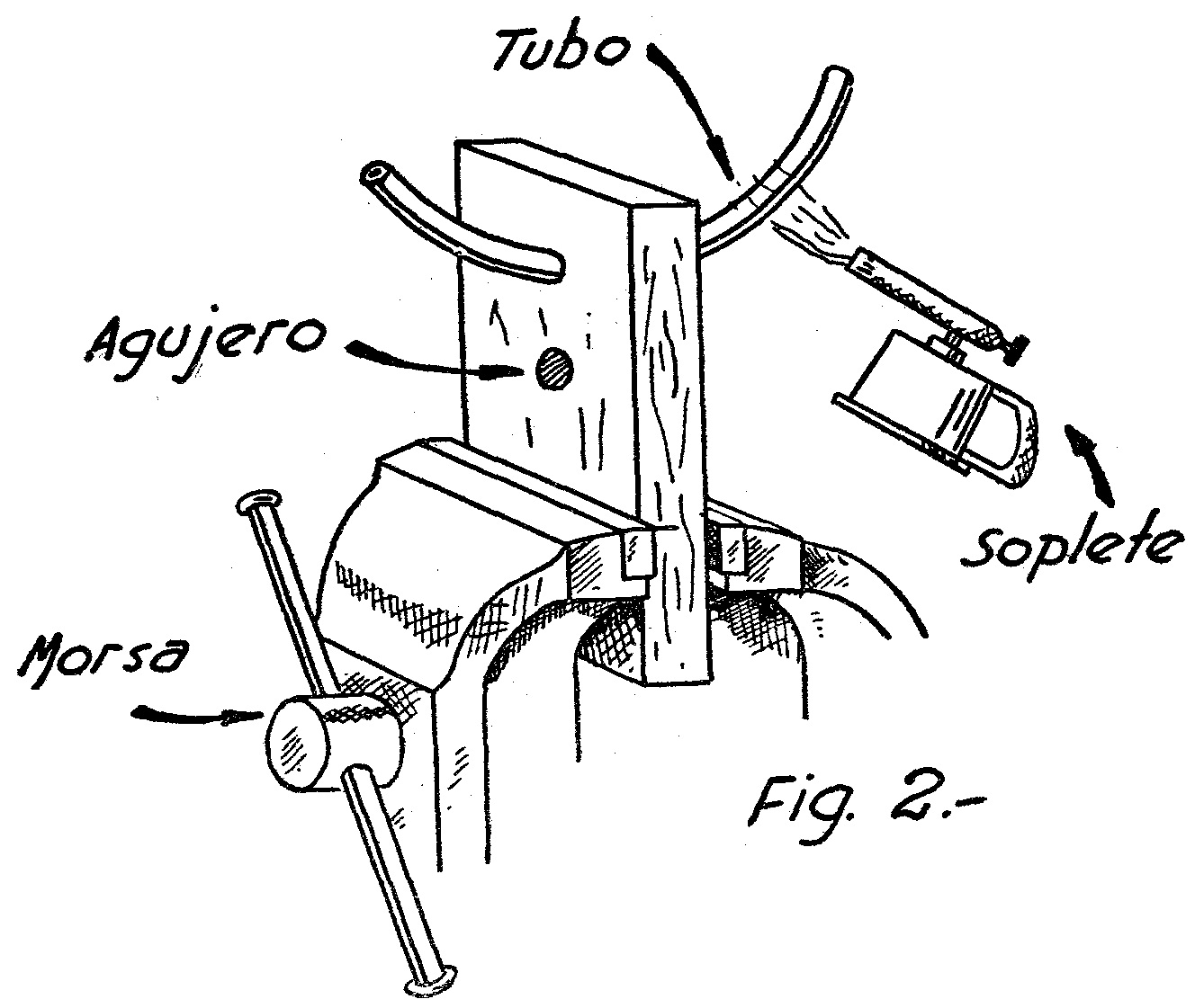Un dispositivo cómodo y de fabricación sencilla, que presta grandes servicios en la tarea de curvar tubos de cobre, consiste en un bloque de madera dura en el cual se practican agujeros cuyos diámetros se correspondan con los diámetros de los tubos de cobre con los que se trabaja. Este bloque se asegura a las mandíbulas de la morsa, y el tubo se hace pasar por el agujero que le corresponda por su diámetro, (Fig. 2).