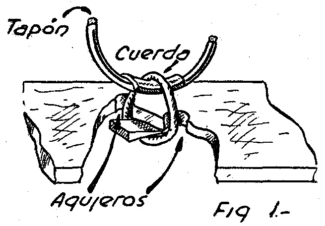 Si se tiene que hacer un codo en un tubo que tenga un diámetro mayor de 2 centímetros, conviene emplear trozos de arpillera gruesa para evitar que el tubo se raje. El trozo de arpillera, que sirve de amortiguador, se mantiene asegurado al tubo por una cuerda que también debe pasar por dos agujeros abiertos en el banco, como se ilustra en la figura 1. La inmovilidad del tubo se asegura además por una cuerda que se introduce con ayuda del martillo entre la cuerda y la superficie inferior del banco.