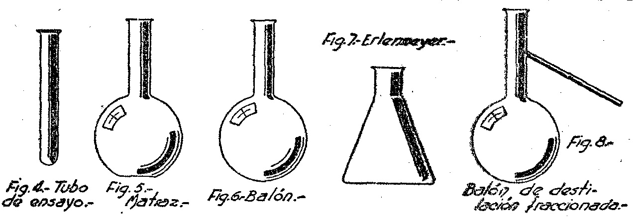 Matraz, balón y vaso Erlenmeyer (figs. 5, G y 7).- Aunque estos tres aparatos no son iguales, pues de los dos primeros uno tiene el fondo chato y el tercero varia en la forma, podríamos decir que su uso es casi el mismo, pues se los emplea para reacciones de más importancia y muchas veces en caliente.
