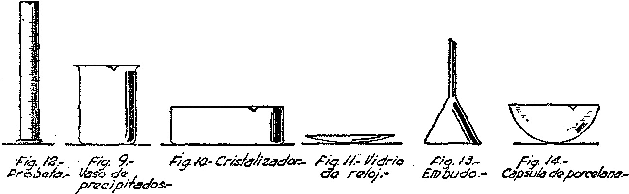 Además, existen una serie de aparatos que creemos que no necesitan una explicación sobre su empleo, y otros que por su poco uso vamos a pasar por alto. Tales, son: embudos (fig. 13), soportes, pinzas, refrigerantes, morteros, telas metálicas con y sin amianto, gradillas, cápsulas de porcelana (figura 14), crisoles, escobillas, etc.