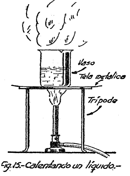 (fig. 15) . Este recipiente deberá estar bien seco por fuera. Al igual que cuando se trataba de un tubo de ensayo, la acción de la llama no deberá ser inmediata, sino que se paseará un instante por debajo del amianto para así poco a poco ir acercándola más hasta dejarlo quieto definitivamente.