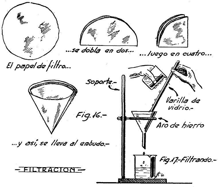 Ante todo, aprendamos a doblar el papel de filtro. Para ello, no hay más que observar las figuras. Primero se dobla en dos, luego en cuatro y por fin se lleva al embudo, cuyas paredes se habrán humedecido de antemano para que el papel se adhiera perfectamente (figura 16). El líquido a filtrar se introduce en el filtro por medio de una varilla de vidrio, en la forma que indica la figura 17.
