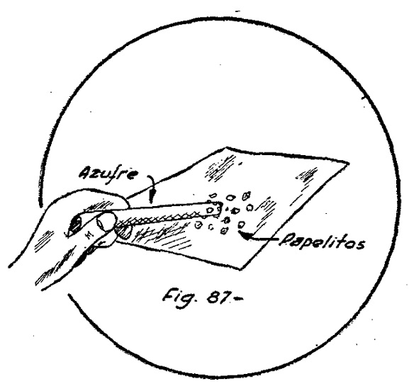 Con un trozo de franela, frote una barra de azufre, y enseguida aproxímela a unos trocitos de papel. Estos, serán atraídos, lo que quiere decir que se ha electrizado (fig. 87).