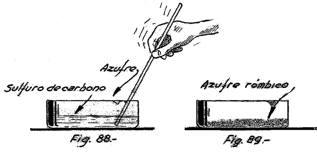 En un cristalizador se coloca un poco de sulfuro de carbono y se le agrega despacio y agitando con una varilla de vidrio, flor de azufre finamente pulverizada (fig. 88). Cuando la solución está saturada, se suspende toda operación y se deja evaporar el sulfuro de carbono a la temperatura ambiente, tratando de no mover el recipiente.