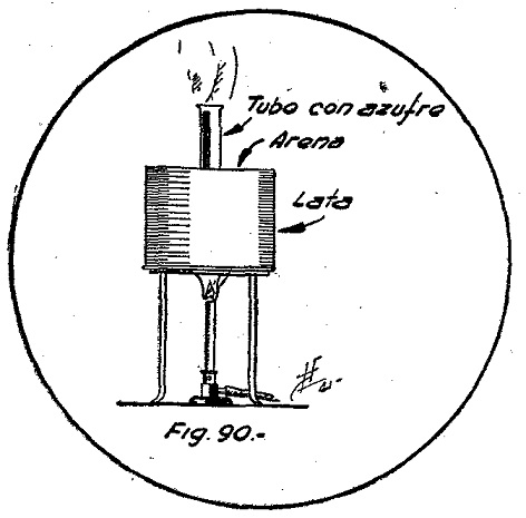 En un tubo de ensayo se colocan unos 10 gramos de azufre y se calienta en un baño de arena hasta que se funda (fig. 90).