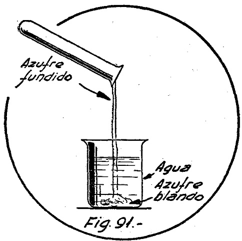 Se puede controlar la temperatura, introduciendo por la boca del tubo un termómetro hasta que toque el azufre. A esta temperatura, se vierte rápidamente el contenido del tubo en agua fría, obteniéndose así una masa elástica que recibe el nombre de azufre blando o elástico (fig. 91).