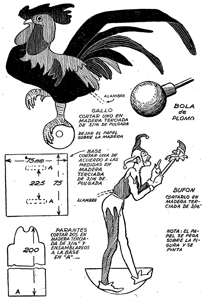Una vez compuestos, los juguetes se balancearán con un movimiento pendular a causa de la bola de plomo en la parte inferior del alambre. El gallo se debe colorear entre dos postes encolados a una base. La base se corta de madera terciada de 3/16 de pulgada. A ésta se le puede agregar una pieza más gruesa y grande de madera para darle mejor aspecto. Los dos parantes son de 20 cm. de’ altura y deben estar a una distancia de 3 1/2 cms. uno de otro. Pueden ser encolados a la base o ensamblados a ella. El extremo superior de los parantes debe estar cuidadosamente redondeado, y recortado circularmente en el centro, para que la pequeña pieza de madera cilíndrica de bajo de las patas del gallo, pueda moverse libremente.