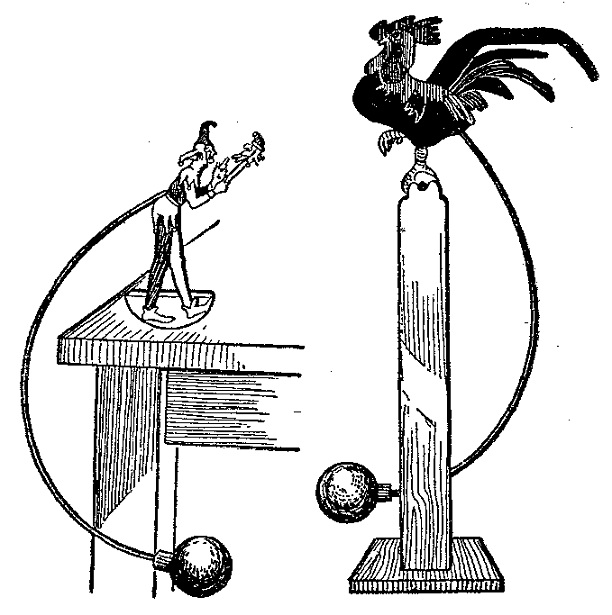La otra figura, – el bufón – se corta de una pieza de madera terciada de 3/16 de pulgada y se le coloca el alambre en el punto señalado. Esta figura debe colocarse sobre una pieza de madera curva para producir el movimiento, cuando se coloca la bola de plomo como en el caso anterior.