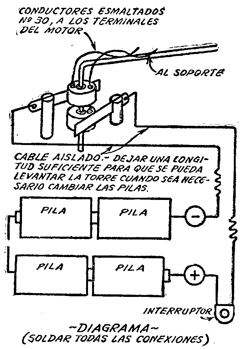 Ahora hay que doblar el tubo del soporte a cualquier ángulo deseado, para dar al avión la inclinación que toma al describir una curva. Se ponen las baterías, conectándolas en serie, como se hace para una linterna eléctrica de mano, se establece el contacto mediante el switch, y se observa desde alguna distancia. Si se ve que el avión vuela para atrás, no hay que preocuparse: basta invertir la posición de los elementos y todo marchará bien.