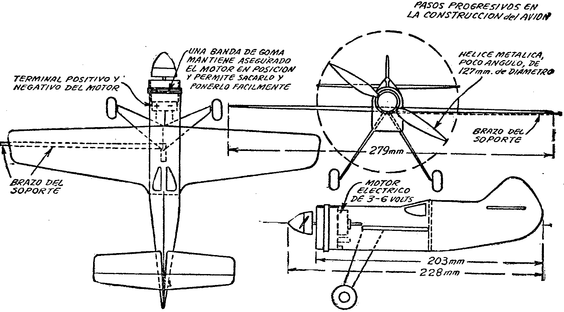 Cuando esto haya ocurrido, se lijan las alas y la cola, o por lo menos, se redondean sus bordes, y se coloca el brazo que soporta la construcción, el que va encolado en la superficie inferior del ala como se ve en los dibujos; en toda la extensión que queda en contacto con el ala, el brazo de soporte debe ser aplanado. Nuevamente se saca el motor, y se le sueldan los conductores que van a los terminales. Se coloca el motor, se pasan los conductores por la cara inferior del ala, pegándolos a la punta de la misma. Se deja una cantidad de cable suficiente para que llegue holgadamente hasta más allá del centro de la torre; más adelante podrá cortarse lo que sobre. Se hace la hélice, de 127 mm. de diámetro con un pedazo de chapa de aluminio, fijándola al spinner de madera de balsa blanda, como indican los grabados.