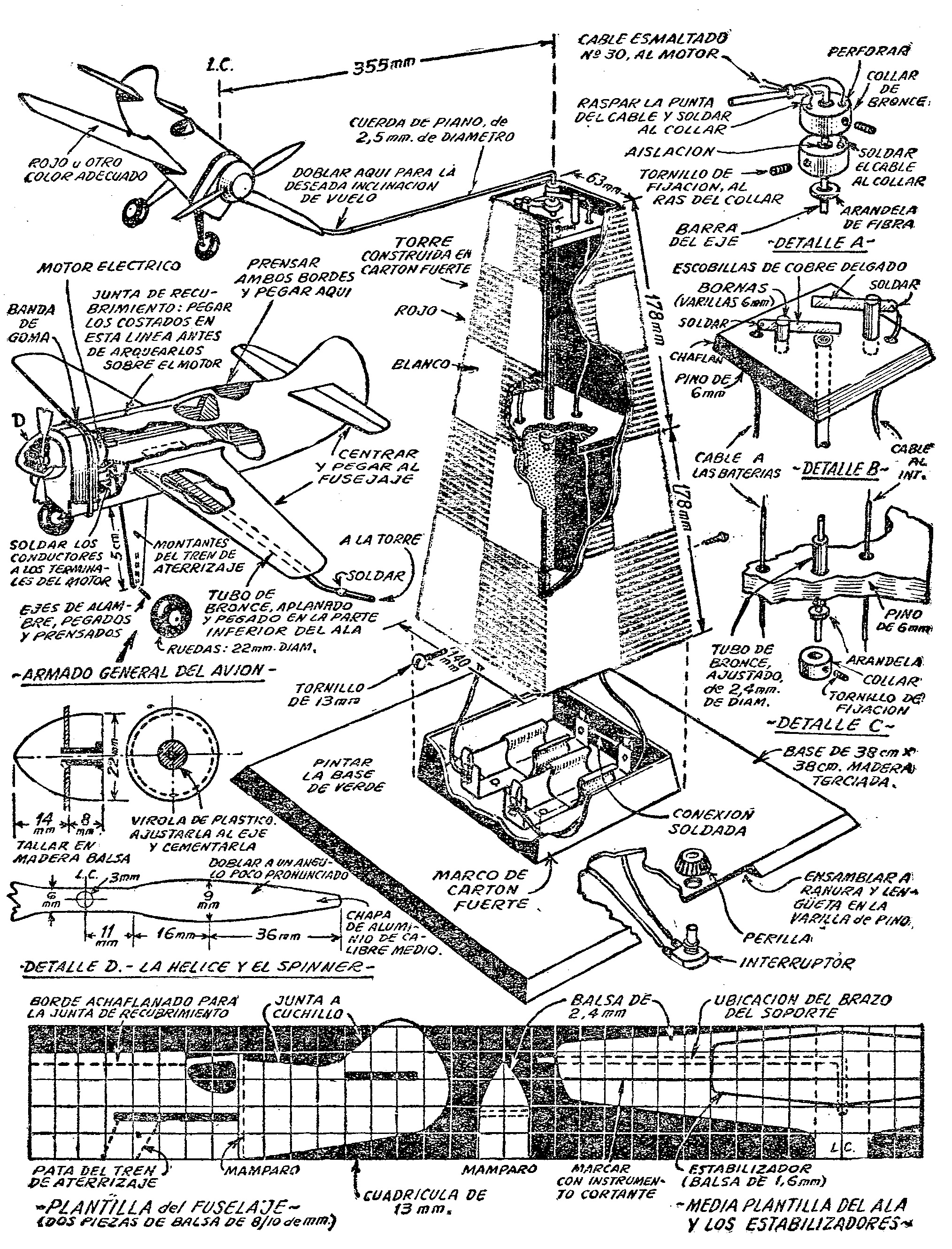 Montado sobre una columna o torre pintada en colores, la que contiene las baterías (pilas para linterna eléctrica) que accionan el motor, este avión, “volará” durante horas. Dadas sus líneas, constituye un juguete muy realista; además, el principio en que se basa puede utilizarse para organizar carreras de dos o más modelos unidos a la misma torre, pruebas de velocidad, etc.