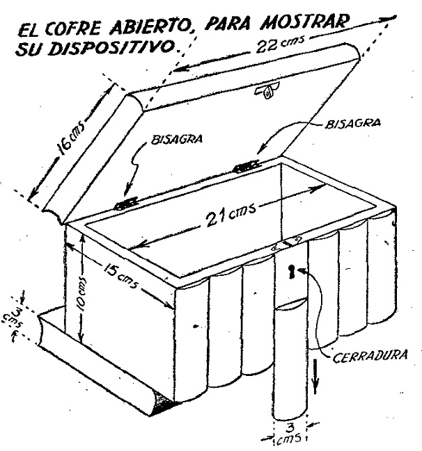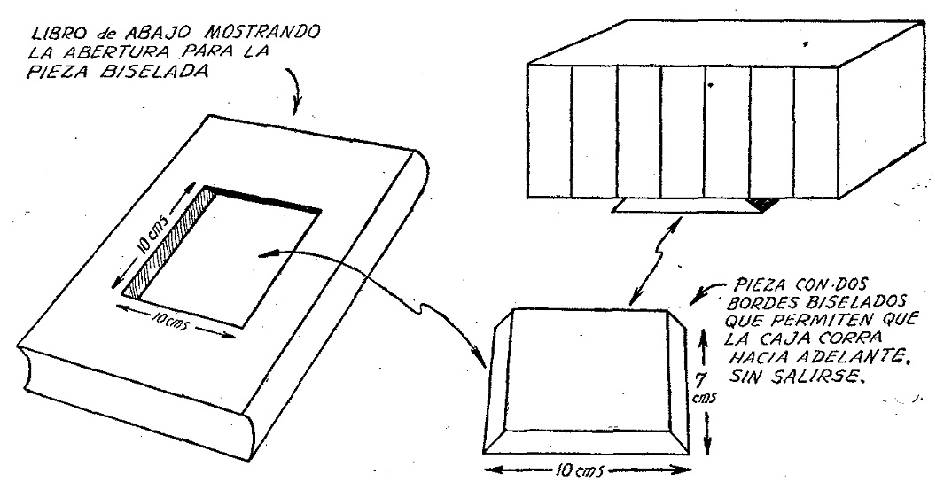 Consiste en una caja rectangular y dos cajas libro, como vimos en el número anterior. El libro de la base lleva los dispositivos que se ilustra, que permite que la caja se corra hacia adelante, permitiendo así correr uno de los listones, que se han hecho de madera gruesa, imitando lomos de otros tantos libros y que deja al descubierto la cerradura.