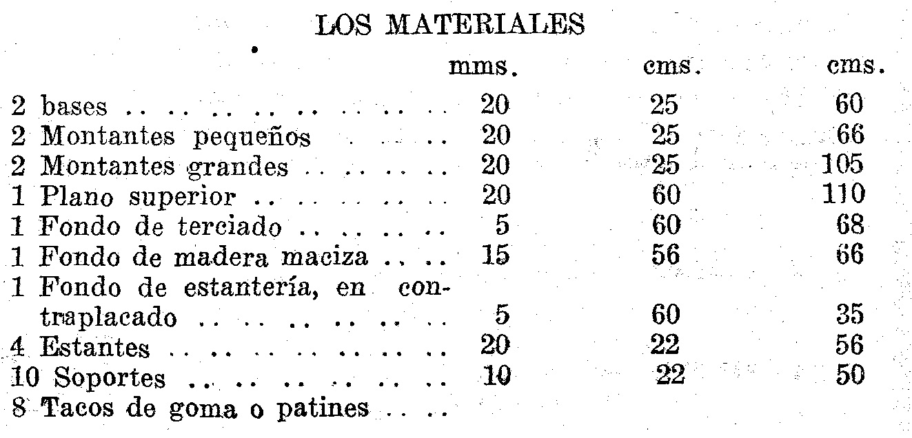 En la parte inferior de la mesa, la estantería del costado izquierdo llevará un estante o dos, como ya se ha indicado. La parte superior tendrá también un estantecito, destinado, sobre todo, a recibir bibelots, un florero, un portarretrato, etc. El fondo de la estantería, en la parte superior, estará formado por una chapa de contraplacado cuyo único oficio es impedir la caída de libros y adornos.