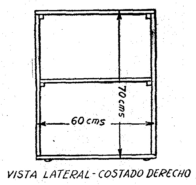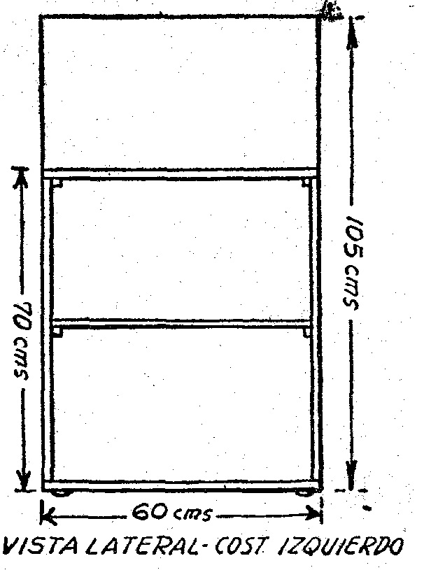 Este costado se compone de dos montantes y de una tabla de base, sobre la que se apoyan los montantes; el conjunto está asegurado por medio de tarugos, según un sistema generalmente empleado. Un estante intermedio o dos, si se prefiere, sostenido por medio de pequeños listones, unen los dos costados y sirven para colocar sobre ellos libros y revistas.
