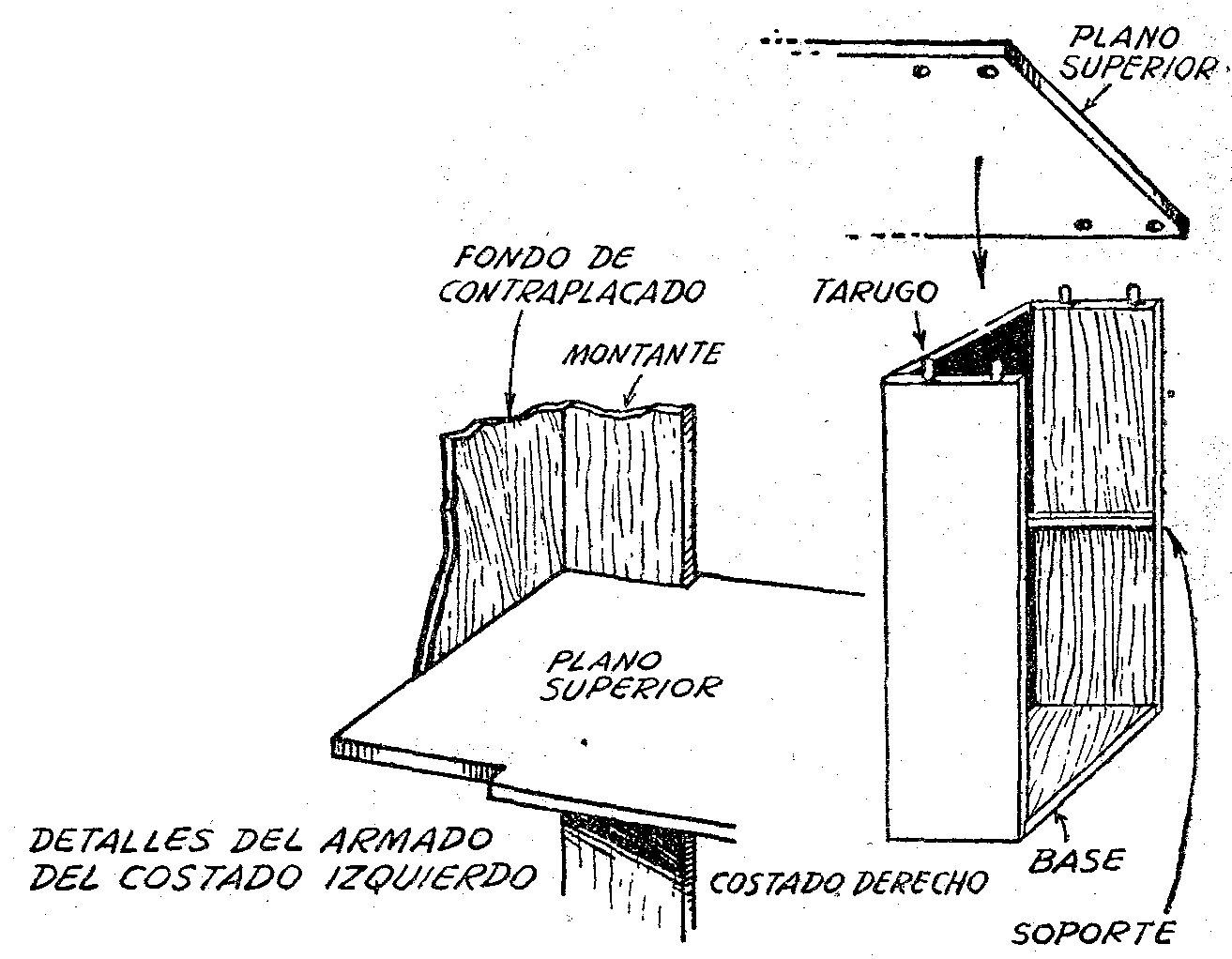 En la parte superior no se presenta ningún problema de difícil solución. Se compone de dos o más tablas, unidad o ranura y lengüeta, en el sentido del largo, pues será difícil encontrar una tabla del ancho necesario. El costado izquierdo se corta en sus dos bordes, de acuerdo a los montantes correspondientes: el plano se arma sobre sus soportes por medio de tarugos colocados primero sobre los montantes de la derecha; segundo, sobre la tabla del fondo de la estantería de la izquierda, y por fin, sobre los soportes colocados en el interior de los dos montantes de esa misma estantería de la izquierda.