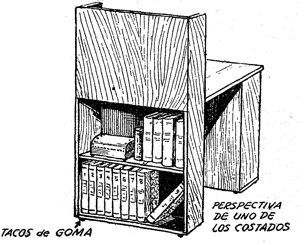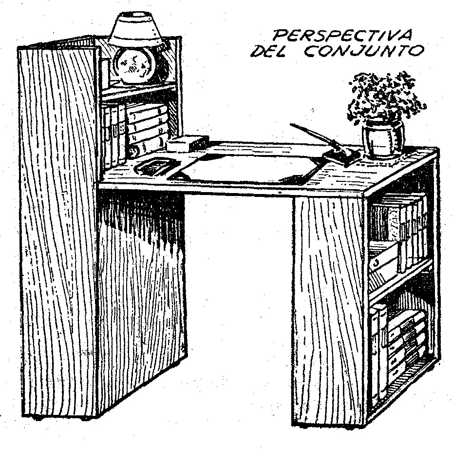 Hemos estudiado la construcción de un mueble, por decirlo así, improvisado y muy útil sin embargo, pues servirá a la vez como escritorio y como biblioteca. Como se ve en las ilustraciones, se compone de dos especies de repisas o estanterías y de una gran plancha que forma la mesa o parte superior del escritorio. Describamos estas diversas partes, admitiendo que el mueble es visto desde la parte ante la cual se sienta la persona que lo utiliza; el tintero y el costado libre quedan a la derecha, para dar libertad de movimientos al brazo de este lado. La repisa o estantería alta queda a la izquierda.