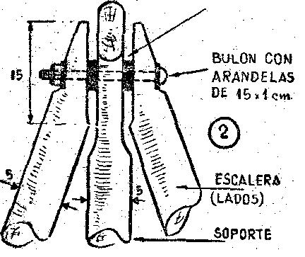 Las ramas tendrán un diámetro no mayor de 5 cm. Se cortarán dos ramas de 1,50 m. para los lados, y otra de 1,85 m. para el apoyo plegable. En la figura No. 2 se muestra gráficamente la manera simple de unir las patas entre sí, de forma que dicha unión permita el movimiento de bisagra.
