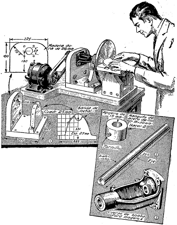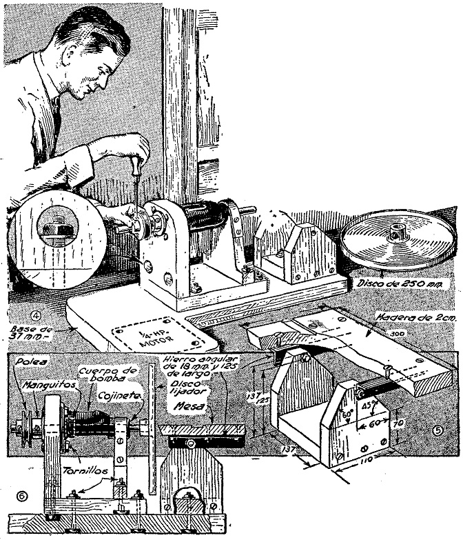 La estructura se centra en una bomba vieja de agua Ford modelo A, que se utiliza como mandril para el disco. Para el objeto conviene elegir una bomba con el menor juego de eje obtenible; se desmonta el eje, la polea y la tuerca de ajuste, cómo muestra la figura 3. En lugar del eje ahusado, se utiliza una varilla de acero trabajada a frío, como indica la figura 2. Uno de los extremos de este eje se filetea para montar el disco lijador, de 25 cms. de diámetro. El cuerpo de la bomba se monta horizontal en un armazón de madera dura, cuyas partes se atornillan firmes en la forma que ilustran, las figuras 1, 4 y 6. Los agujeros originales de la base del cuerpo de la bomba se usan para atornillar esta pieza contra el montante trasero de la armazón, en tanto que con una banda de metal se sujeta el otro lado sobre el rebajo del montante delantero. Virolas o manguitos, como el que ilustra la figura 2, se emplean para impedir juego del eje en el extremo. Estos se ajustan bien al eje mediante tornillos, colocando uno a cada lado del soporte trasero, como muestra la figura 6. Entre el manguito exterior y la madera se coloca una arandela, para evitar desgaste. En el extremo posterior del eje se monta una polea tipo U de 7,5 cms. de diámetro. La figura 5 ilustra claramente el ensamble de la mesa de lijar. Las piezas de base se ensamblan con cola y tomillos y se cortan los lados para pivotar la mesa a ángulo de 45°, o sea para darle ese juego, la fijación de la mesa o tablero al ángulo deseado se efectúa ajustando las tuercas de los tornillos que pasan por los sostenes de hierro angular en que va montado el tablero. A falta de escala para graduar, la mesa se puede colocar en la posición deseada utilizando una escuadra de comprobación y un cartabón.
