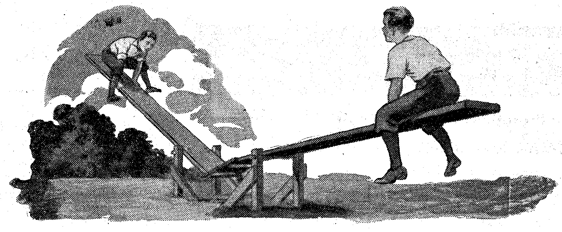 La construcción no es tan complicada como podría parecer; primero se arma la base, de maderos de 50 por 127 mms. de sección, enterrándolos en parte, para dar seguridad al conjunto. En los miembros verticales se hacen orificios que permiten la inserción de tubos de 25 mms., de hierro galvanizado, sobre los que se apoyan las tablas del sube y baja, que se fijan en posición por medio de pernos en U. Las tablas miden 3,88 m. de largo y 178 mms. de ancho; su espesor es de 50 mms. y en uno de sus extremos deben tener un orificio de suficiente tamaño para permitir el paso de una barra de 14 mms. de diámetro. Los pernos en U se colocan a 1.143 mms. de este extremo.