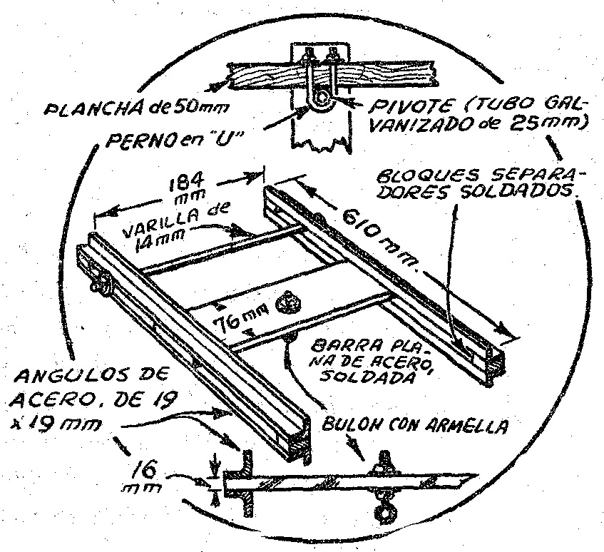 La articulación entre las dos tablas se hace con ángulo de hierro, en la forma y dimensiones indicadas en el detalle correspondiente; en los extremos del ángulo se sueldan bloques separadores que dejan un espacio entre las dos secciones de ángulo, colocadas una arriba y otra abajo; ese espacio constituye la corredera por donde se desliza la barra de 14 mms. pasada por el extremo de cada tabla, una de las partes que proporciona el original movimiento de este juego.