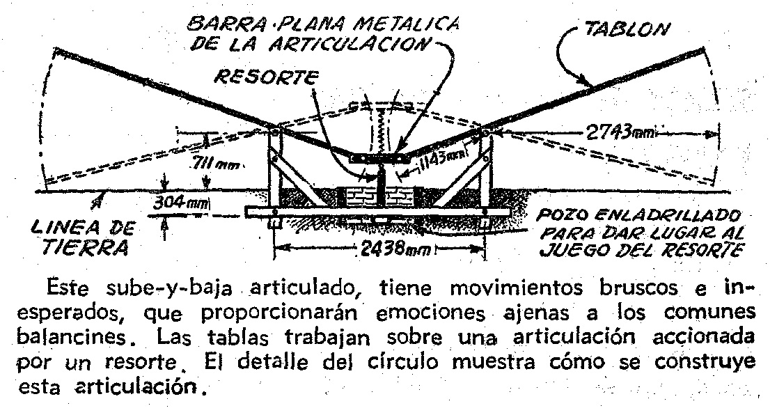 Los toboganes y las hamacas son parte integrante de estos equipos, que no necesitan explicaciones de construcción; se requieren, además, uno o dos juegos nuevos, entre los que recomenmos el interesante sube y baja articulado y el gigantesco '' taburete de piano'' que vamos a describir.