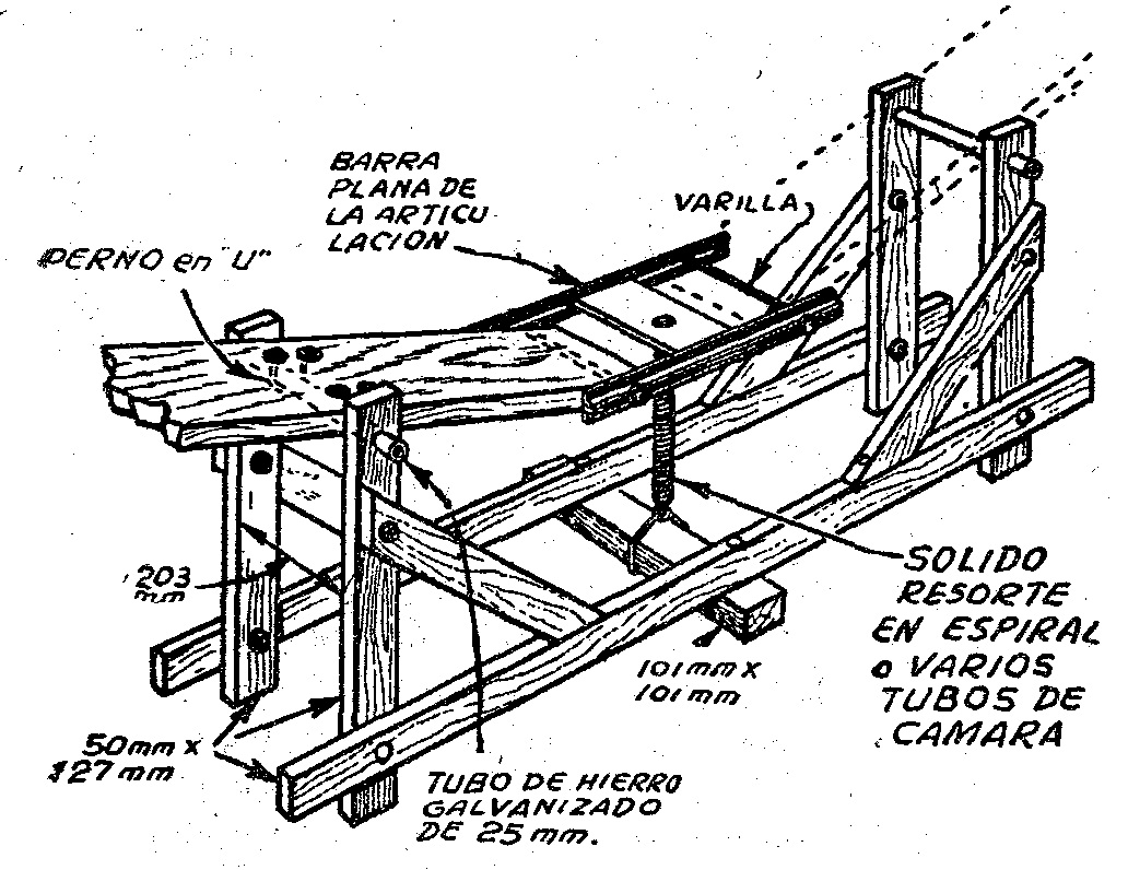 En el centro de las correderas de ángulo de hierro se suelda una pesada chapa de acero, a la que se une un fuerte resorte en espiral, que es el que produce los "brincos" del aparato. La parte interior del resorte se fija sólidamente a un travesaño de madera de 101 x 101 mms. colocado en la base, transversalmente. Si no se consiguiera un resorte suficientemente fuerte, se lo podría substituir por unos pedazos de cámara.