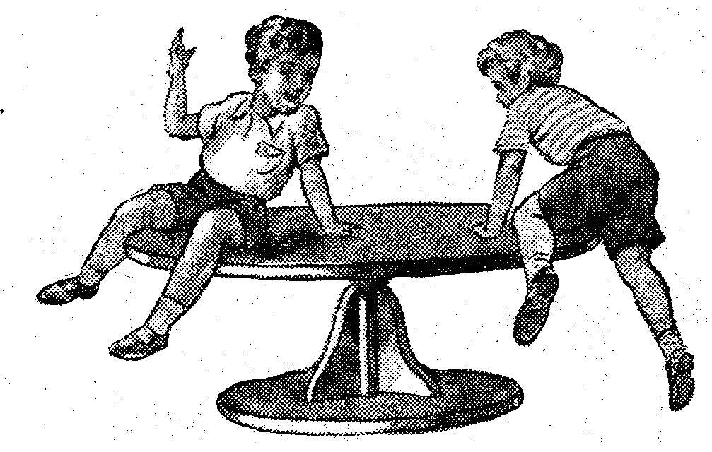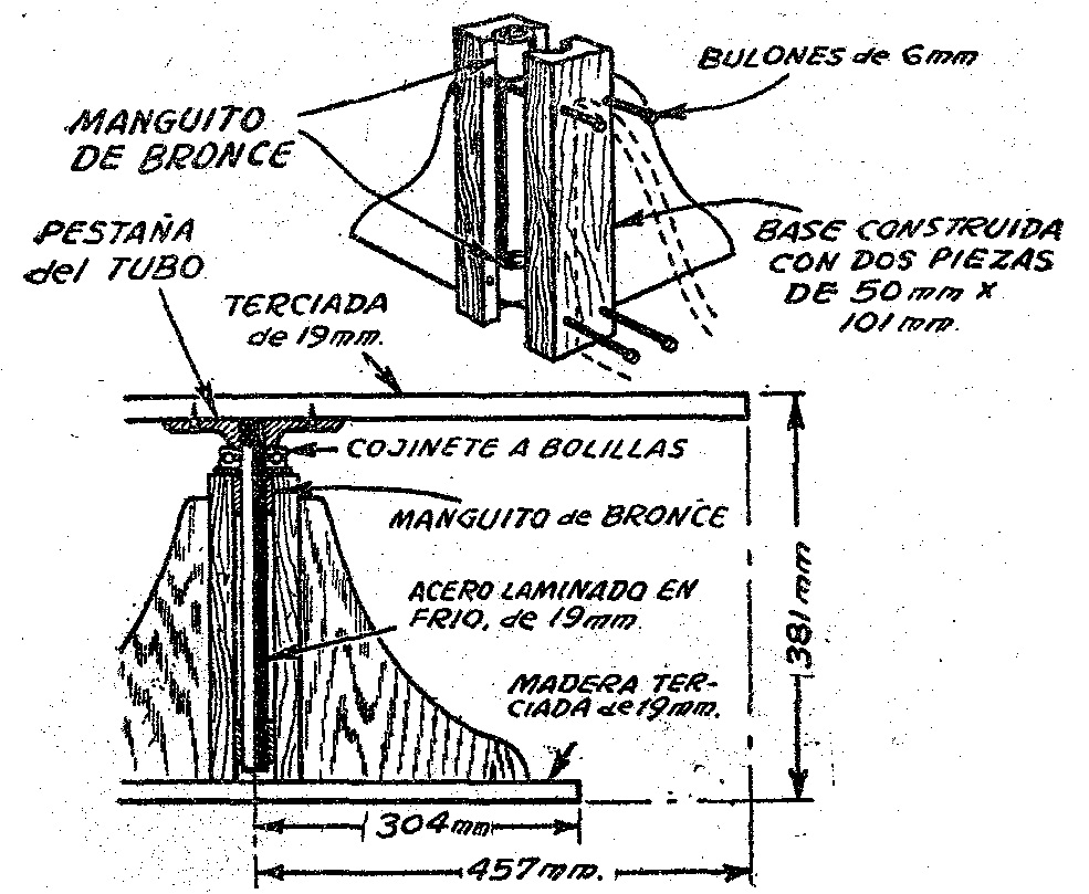 La parte superior, es un disco de madera terciada de 914 mms. de diámetro y de 19 mms. de espesor; se monta sobre un eje de acero que gira dentro de dos manguitos de bronce. El peso es soportado por un buen cojinete a bolillas, que puede conseguirse en cualquier casa de repuestos usados para autos. La base sobre la que gira el disco es un simple pie construido con madera de 50 mms. por 101 mms., unidas como se ve en la figura, y euyo centro se ranura; se sostienen entre ellas con bulones, dándoles la rigidez necesaria para sostener los manguitos de bronce. Se cortan cuatro refuerzos con madera de 25 mms., y se los asegura a la parte central del pie y a la base de madera terciada, completando esta miniatura de calesita.Todo el borde del disco superior se alisa con papel de lija, para librarlo de asperezas peligrosas para las criaturas, y luego se termina todo el taburete esmaltándolo en colores alegres.