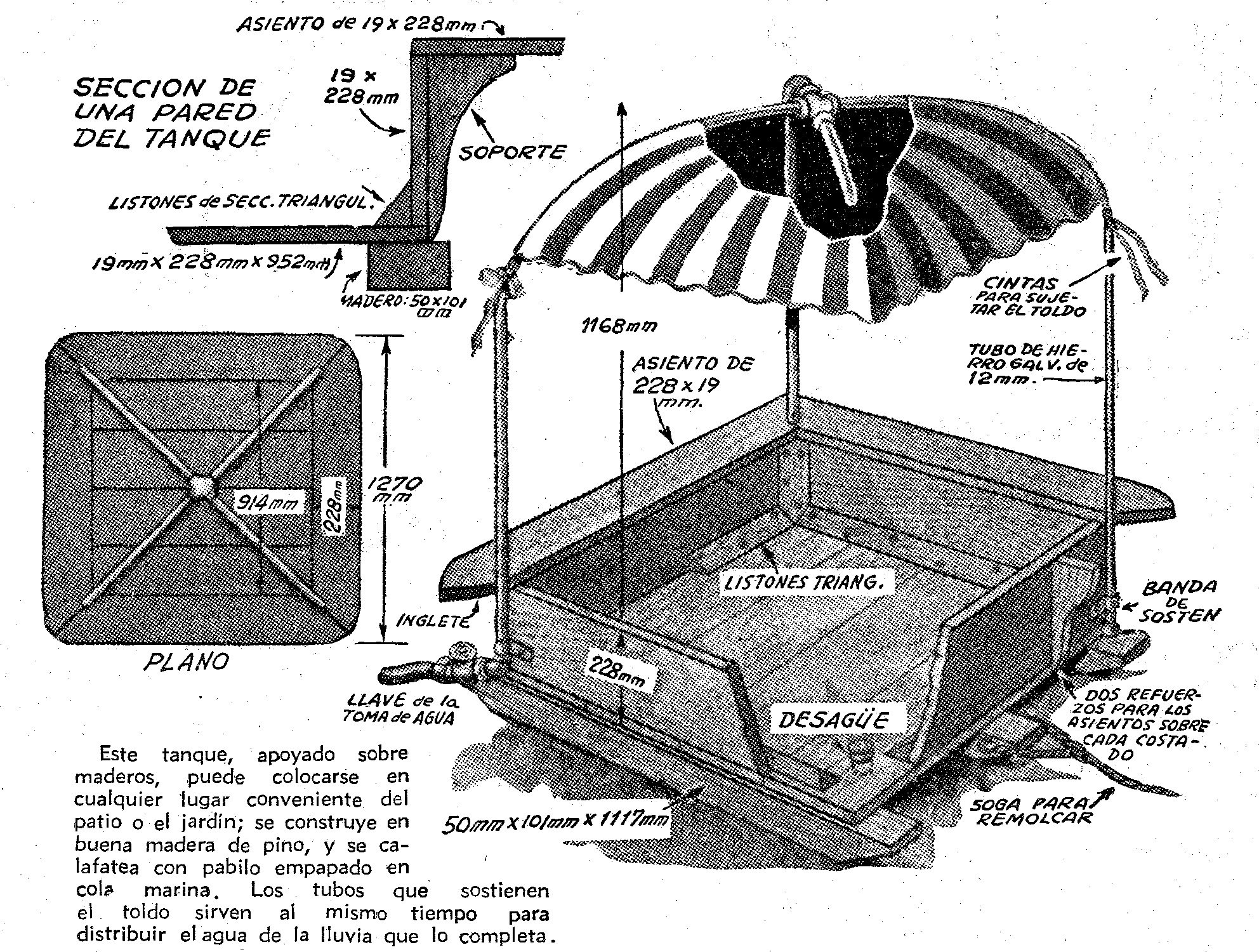 Los costados del tanque se fijan sobre listones de sección triangular clavadas a lo largo de las juntas, y que no se colocan directamente sobre la madera, sino sobre una base de pabilo y cola marina. Sobre los costados del tanque se colocan cuarteo tablas de 19 mms. de espesor y 228 de ancho, para proporcionar asientos para los jóvenes bañistas; el largo de estas tablas es de 1.270 mms., todas sus aristas van redondeadas, en la forma que indican los dibujos.
