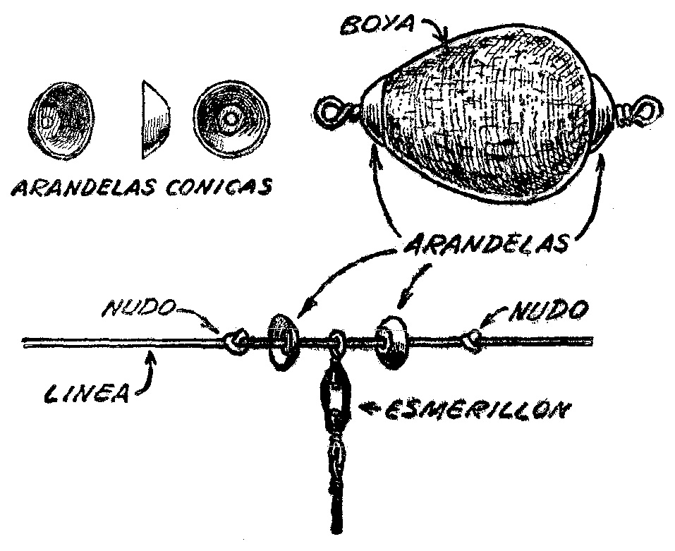 Para su empleo, comenzaremos por hacer el aro en el alambre, para introducir luego una arandela, luego la boya y por último la segunda arandela y rematar el aro final sobre ella, tratando que quede lo más ajustado posible, Su ínfimo peso no influye como lastre y la terminación de la boya, en cuanto a su estética, es completa.
