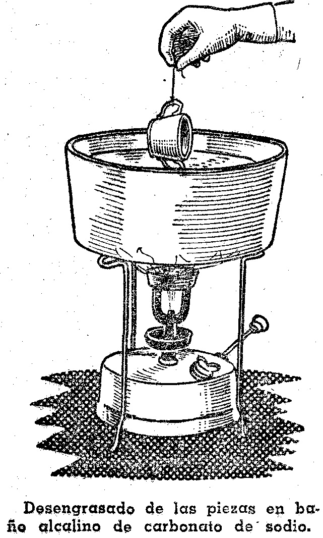 Si se dispone de recipientes de material vítreo y el tamaño de los mismos y el de los objetos a tratar lo permite, puede efectuarse un buen desengrasado sumergiendo las piezas en un baño caliente de agua en la cual se ha disuelto carbonato de sodio en la proporción de 100 gr. por cada litro de agua. Después de este tratamiento, las piezas se lavan con agua limpia y se secan con aserrín.