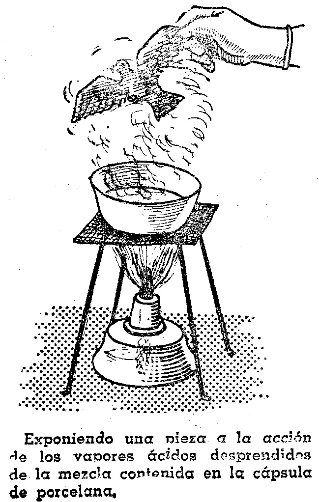 Después del tratamiento con este baño, los objetos se lavan dejando correr agua limpia y, después de secados con aserrín, se someten a la acción del azufre en solución con hiposulfito de sodio, acidificado con. unas gotas de ácido clorhídrico.