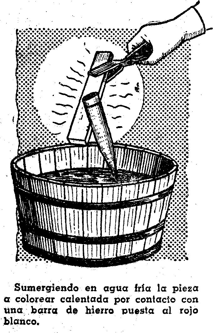 Se calienta una barra de hierro que guarde proporción con la pieza que se quiere azulear y, cuando la mencionada barra se encuentra al rojo, se asienta sobre la misma la pieza, la cual, en contacto con la barra caliente, va tomando distintos tonos de coloración, desde el amarillo pálido al azul obscuro; cuando se observa que ha adquirido el grado de color deseado se deja caer rápidamente en un recipiente con agua fría y, en esta forma, conserva su coloración; luego se seca en aserrín caliente y, una vez bien seca, se frota suavemente con miga de pan mojada en aceite de oliva.