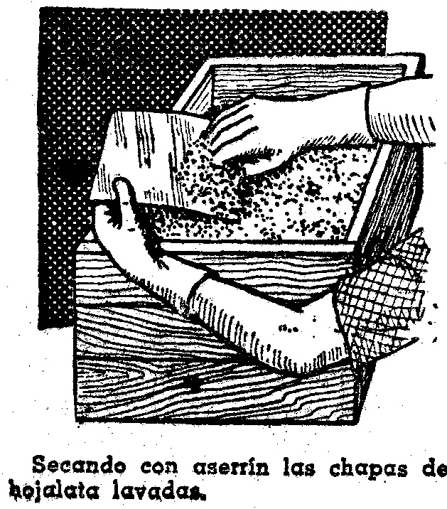 Se lava cuidadosamente la hojalata con una brocha y seca, se trata con una mezcla de aceite de linaza cocido y 2 partes de laca al copal obscura y se seca en una estufa.