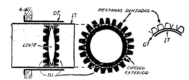 Para la montura de las lentes hay que cortar un tablero de fibra cuyas medidas sean iguales a dos diámetros de la lente por tres veces y medio el mismo diámetro. Con esta pieza se forma un tubo, que en las figuras se marca IT, en cuyo interior calzará bien la lente, y se encolan los bordes formando la unión o costura. Con el mismo material del tubo se hacen los dos diafragmas DI, cortándolos en la forma indicada. El diámetro del círculo indicado con líneas de puntos es exactamente igual al de las lentes, mientras que el que se representa con una línea llena es 13 mm menor. Los dientes tienen 13 mm de largo.