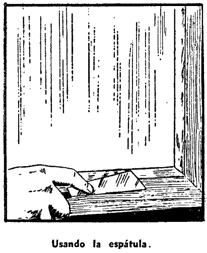 La colocación de la masilla ofrece algunas dificultades para quien no tenga práctica en el oficio, pero la observación de sus reglas la facilitará mucho. Gran parte del éxito depende de la consistencia de la materia y del tipo de espátula, utilizada. Es conveniente que esta herramienta tenga una hoja de unos 3 1/2 cms. de ancho, larga y flexible. Uno de sus ángulos debe ser redondeado, y el otro estar cortado en ángulo vivo. En esta forma la masilla puede ser colocada a lo largo del vidrio formando chanfle con el lado redondeado, mientras que el cortado en ángulo vivo servirá para terminar los ángulos con la mayor prolijidad.