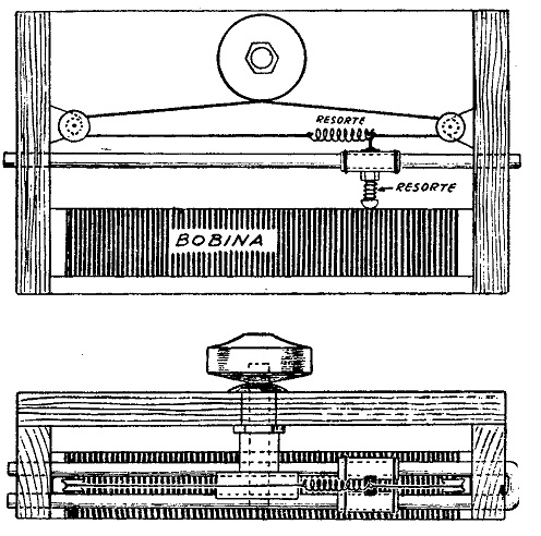 Para correr esta pieza en la corredera de cobre basta un hilo que pasa por dos rueditas en las puntas fijas a los bordes y un tamborcito unido a un eje y a una perilla de radio, y se regula a voluntad la longitud de la bobina.