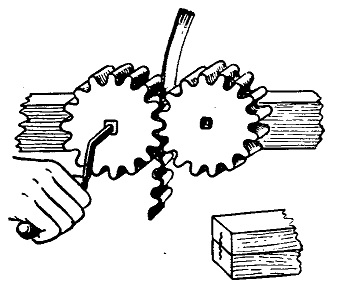 La ilustración explica con toda claridad mi idea: por medio de dos engranajes fuera de uso se pueden corrugar sunchos, alambres finos y gruesos, etc., de frecuente aplicación, los primeros, para la unión de tablas como muestra el dibujo inferior y, los segundos, para cercos tejidos.