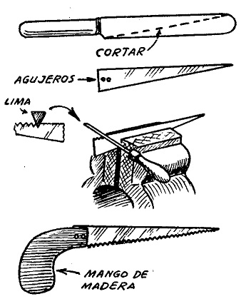Se corta a lo largo con un cortafrío siguiendo la línea punteada de la figura superior; se fija el triángulo metálico resultante en una morsa y se practica, con el mayor cuidado posible, una serie regular de dientes en toda la longitud de uno de los bordes. Este trabajo es posible mediante el uso de una lima triangular del tamaño más chico posible. Se afila en la piedra y se introduce en un mango tallado en madera, con lo que queda lista la sierra.