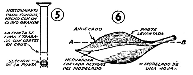 Los fondos pueden dejarse lisos raspándolos con un escoplo sostenido verticalmente, o bien con el borde de un vidrio grueso, o con una herramienta para fondos; una muy conveniente puede hacerse con un clavo grande o con un punzón, cuya punta se lima y se trabaja luego con cortes cruzados, también hechos a lima, según figura 5.