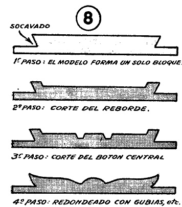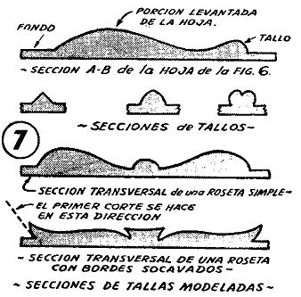 Si un motivo ornamental está compuesto por flores u hojas, es conveniente conseguir algunos modelos naturales para copiar sus detalles al trabajar la talla. El modelado puede hacerse con cualquier instrumento conveniente para hacer un corte adecuado. El tallista no debe temer cortar piezas grandes de la superficie del follaje si esto fuera necesario, pues en términos generales cuantas más curvas tenga éste, más natural y vivo parece. En la naturaleza no existen hojas completamente planas. La fig. 7 muestra unas pocas secciones de modelados. Las flores y las rosetas, especialmente, así como los motivos semejantes a ellas, deben modelarse con el mayor relieve que se pueda, para sacar todo aspecto de chatura o aplanamiento. Hay que prestar atención para que los bordes de las hojas y pétalos no resulten demasiado gruesos y pesados; se los aligera, sea rebajándolos con un declive hacia el fondo, o socavando bajo ellos, como indica la fig. 7. Al socavar, el corte oblicuo es el que se hace primero, practicando luego el horizontal. Si se hiciera primero el horizontal, se correría el riesgo de astillar la roseta o la hoja, arrancándola del fondo. El socavado se hace con un escoplo pequeño y los bordes se terminan a gubia. La fig. 8 muestra los distintos pasos en la talla de una roseta. Para los cortes terminales no se1 debe usar la maceta, pues es suficiente la simple presión de la mano.