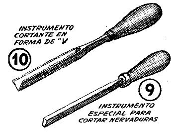 Las nervaduras y otros detalles se consiguen con una herramienta especial para ese uso, y que no es otra cosa que una gubia de muy poca profundidad (fig. 9). También pueden hacerse con una pequeña herramienta cortante, con corte en forma de V (ver fig. 10). Posiblemente sea preferible esta última, aunque se trata de una cuestión puramente personal, pues como la herramienta especial es pequeña y profunda, tiene tendencia a trabarse en los cortes y no es fácil mantenerla en buenas condiciones de trabajo.