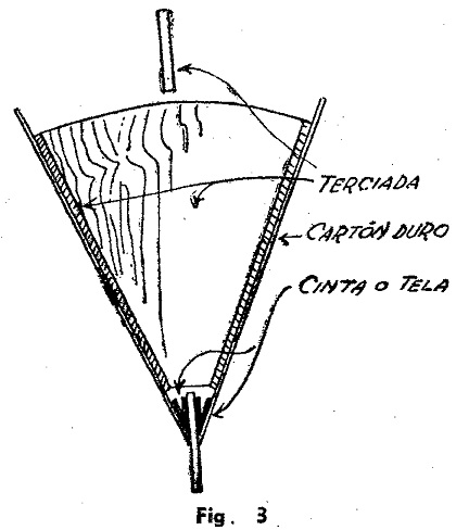 La figura .3 explica la construcción del compartimento movible. Debe formar un ángulo de unos 45°. Se hace primero en madera terciada, dejando las dos chapas ligeramente separadas en el fondo. Sobre cada una de ellas se pega un cartón bien rígido, que sobrepasará 1 1/2 cm. sobre los bordes de la madera, disimulando las junturas y actuando como tope de retención.