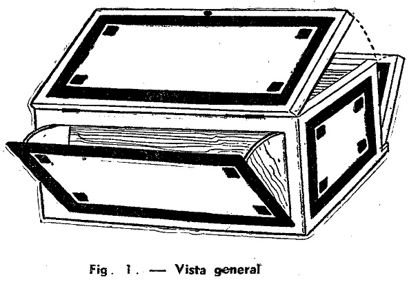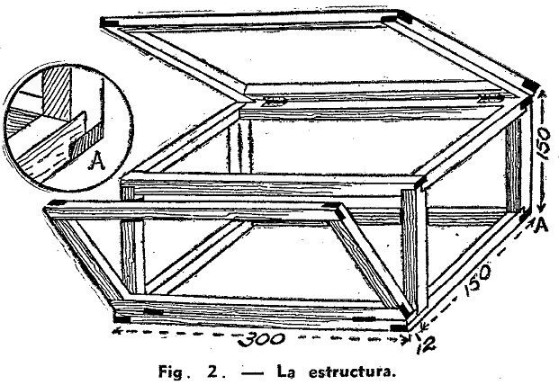 En cuanto a la construcción de la caja, se aplica terciada para los paneles y las tapas. Esta se fija a un armazón de madera de 12 mm., cuyo espesor es rebajado mediante cortes que lo reducen a la mitad, y encolado, como se ve en la figura 2. Para las tapas se usan dos pares de bisagras pequeñas. En cada una de ellas puede ponerse un botón, como se ve en la figura, con una agarradera para la tapa del frente.