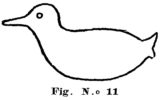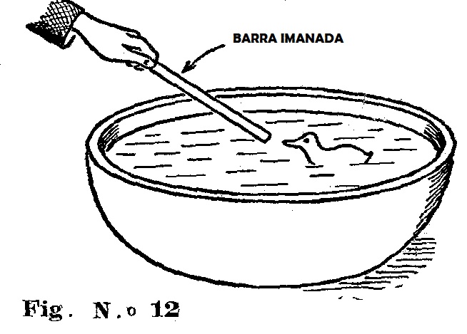 Este interesante juguete se basa en el siguiente experimento. Hágase una figura de un pato, de un trozo de madera, como se ve en la figura 11, y de modo que flote en el agua. Cuando se haga el pato, ocúltese en su pico una pequeña barrita de acero imanada. Ahora, si se acerca el polo norte de una barra imanada el pico del pato este seguirá los movimientos de la barra, como ilustra la figura 12. Si se acerca el polo sur, el pato retrocederá.