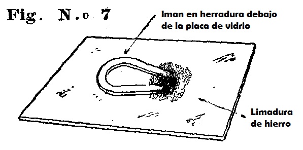 Repítase luego el experimento con un imán en herradura, y se comprobará, que las líneas de fuerza que se formen entre los polos de este, serán más fuertes que las que se formaron antes entre los de la, barra, como se ve claramente en la figura 7.